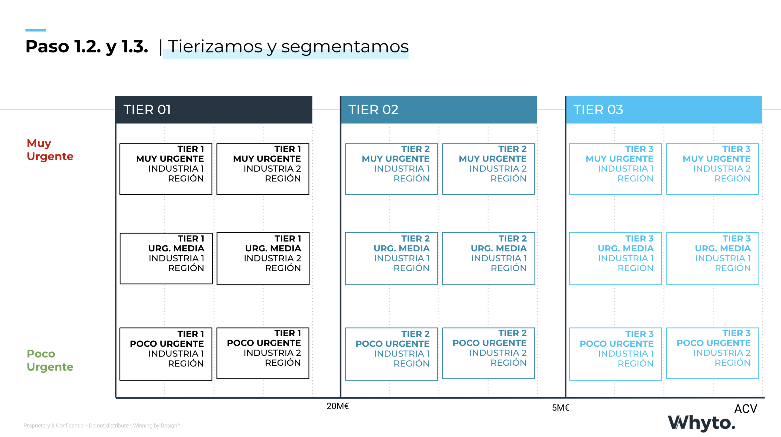 Una empresa que vende consultoría legal puede clasificar como Tier 1 a las Grandes Corporaciones con contratos recurrentes, mientras que las startups en crecimiento serían Tier 3.